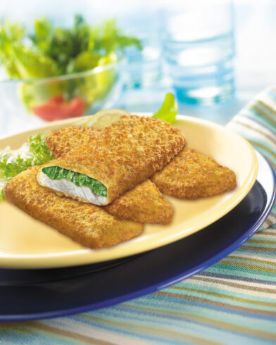 Ingredienti: Filetti di MERLUZZO d'Alaska (50%), crema agli spinaci (20%) [spinaci (11%), acqua, PANNA, MOZZARELLA, amido di riso, olio di semi di girasole, sale, noce moscata], farina di FRUMENTO, olio di semi di girasole, acqua, amido di patate, sale, destrosio, lievito, spezie, contiene olio di semi di girasole e/o colza
