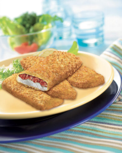 Ingredienti: Filetti di MERLUZZO d'Alaska (50%), salsa al pomodoro (concentrato di pomodoro, cipolle, pomodori (3,5%), acqua, SEDANO, farina di GRANO, amido di patate modificato, sale, PANNA in polvere, zucchero, olio di semi di girasole, LATTOSIO, piante aromatiche (timo, prezzemolo), spezie (levistico, macis, chiodi di garofano, bacche di ginepro), ortaggi in polvere (cipolle, porri), contiene olio di semi di girasole e/o colza), lievito) (20%), farina di GRANO, olio di semi di girasole, acqua, amido di patate, sale, destrosio, lievito, spezie (paprika, curcuma), contiene olio di semi di girasole e/o colza