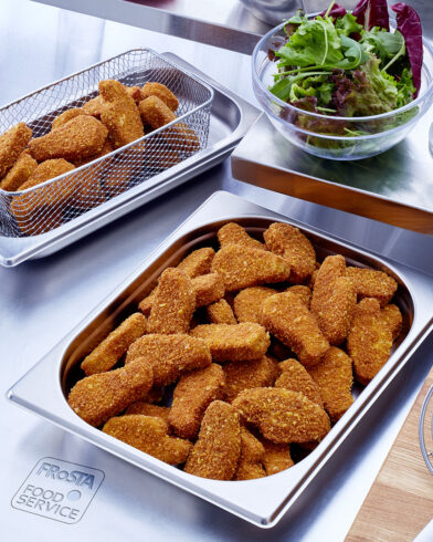 Prodotto vegano senza soia, a base di ortaggi come cavolfiore e scorzonera con jackfruit e proteine dei semi di canapa parzialmente disoleati. Tante forme diverse da circa 40 g ciascuna, con un rivestimento di pangrattato speziato, prefritti, surgelati. Perfetto per tutti i tipi di preparazione anche nel forno combinato a vapore.