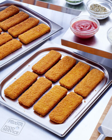 Prodotto vegano senza soia, a base di ortaggi e legumi: fagioli, scorzonera, jackfruit, con proteine dei semi di canapa parzialmente disoleati e olio di lino come fonte di omega-3, a forma di filetto, impanato con l‘impanatura originale FRoSTA, prefritto, surgelato. Adatto a tutti i tipi di preparazione, in particolare anche nel forno combinato a vapore senza ulteriore aggiunta di grassi.